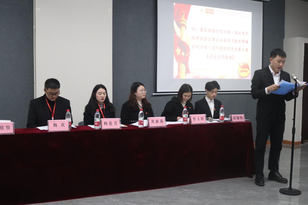 淬炼·国际商学院第二届学生会委员会委员王玉金作了《肩负新时代学生使命,汇聚青春新力量,开创学院发展新局面》的学生会工作报告,回顾总结了过去一年的工作经验和成绩、问题和不足,明确提出重庆移通学院淬炼·国际商学院第三届学生委员会的奋斗目标和努力方向;推进四大版块全面化、系统化、制度化和多元化,积极响应学校完满教育,“取其精华,去其糟粕”。