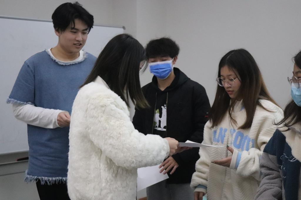 紧接着进入会议第三项,通过“一战到底”游戏的形式检验同学们大一一学年的学习态度,主持人进行提问,不符合条件的同学们依次坐下,站到最后的同学也一一进行自我分享,给予同学们更多的学习动力和经验。在上一学年同学们的不懈努力中获得了良好的成绩也得到了学院的认可。“三好学生、优秀干部......”一个个名字、一张张奖状,都是对大家上一学年的认可,辅导员廖进老师对同学们进行颁奖并鼓励大家再接再厉。