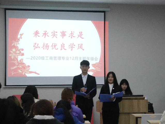 2020级工商管理专业12月主题年级会完满结束,最后希望各位同学凭自己的辛勤汗水和真才实学,在考场上发挥出色水平,从自身做起,以诚信考试为荣,以违纪作弊为耻,弘扬求实学风,维护知识尊严!
