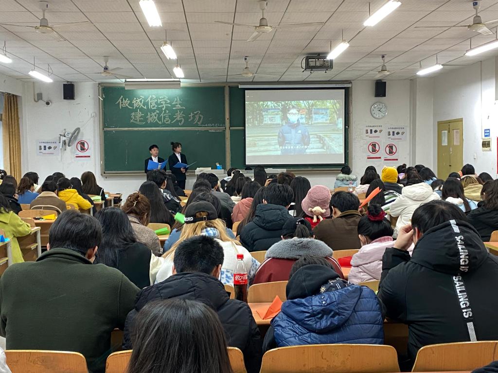 会议开始,主持人借诚信含义向同学们讲述了几则诚信小故事,继而浅述了诚信对于学生自我发展和为人处世的重大意义,由此步入主题。通过一个诚信小短片向同学们具体列举了考试违规行为及相应处罚,以此表明诚信应考的重要性,并以具体案例告诫各位同学严守诚信防线,诚信为本,文明考试。言必诚信,行必忠正。鲁迅先生曾言:“诚信为人之根本也。”诚信是高尚的人格力量,诚信应考是道德品格的体现,也是公平考试的前提和必要条件。期末之际,作为新时代的青年大学生,我们应当以身作则,做好期末复习,共建诚信考场。以扎实的知识、良好的品格和求真的态度向自己交上一份真实答卷。