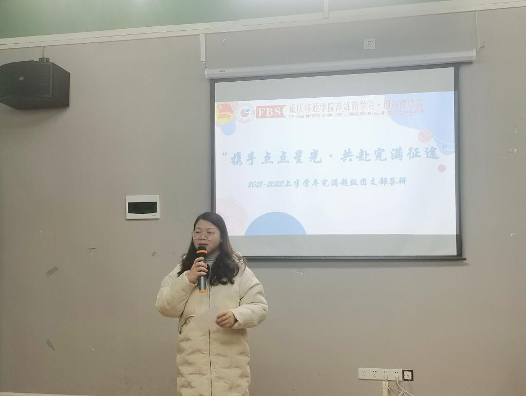 在2021-2022学年“完满征途换新·完超步履不停”——完满超级团支部评比活动全面开展的背景下,我院团总支积极响应、各团支部积极承办。为进一步助推支部文化建设,展示支部独特风采,促进各支部经验交流,淬炼·国际商学院团总支于2021年12月24日下午3:30在花果书院多功能活动室开展以“携手点点星光·共赴完满征途”为主题的淬炼·国际商学院2021-2022上半学年完满超级团支部答辩活动。本次答辩活动特别邀请到淬炼·国际商学院团总支书记黄新燕及各版块指导老师担任评委。