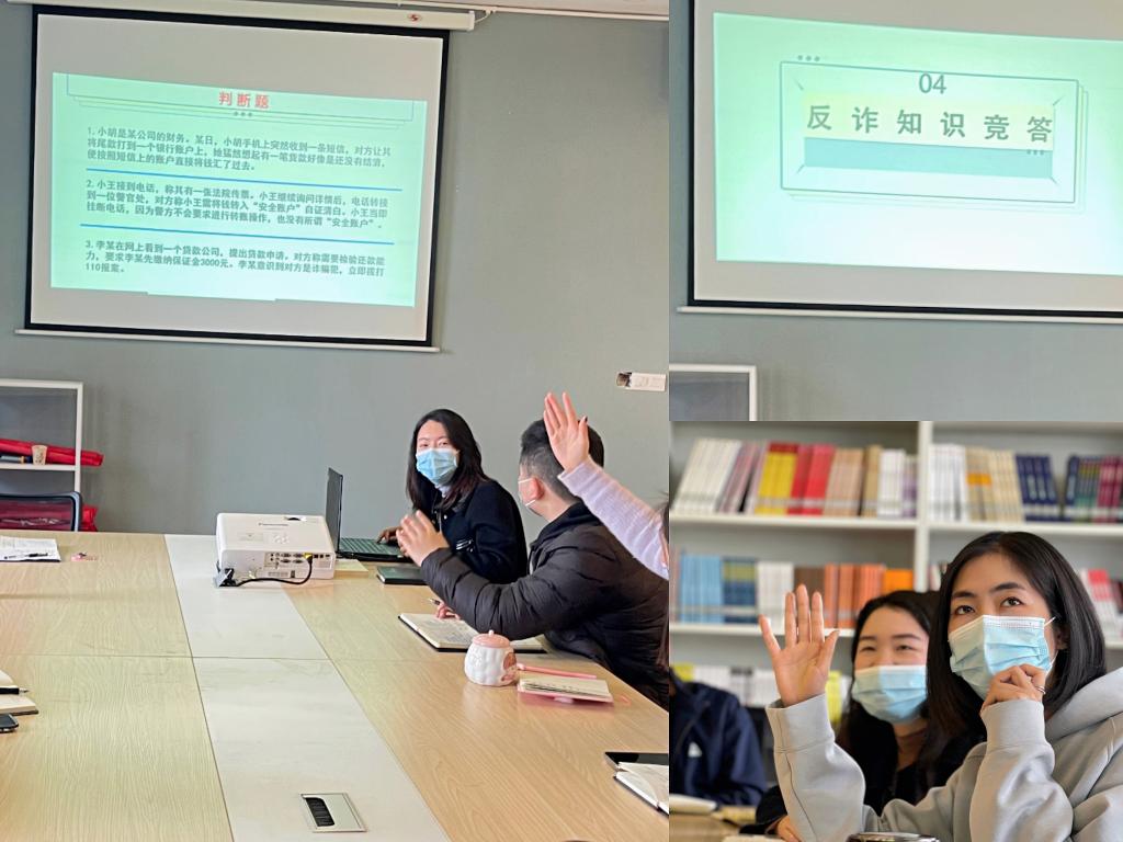 辅导员作为一个年级的“领头羊”,应强化自身知识储备,强化头脑武装,做好学生表率。据此,本次沙龙为辅导员团队准备了反诈知识竞答,从我院储备的反诈知识库中,抽取典型案例作为竞答题目,囊括了刷单、贷款、虚假购物等类型。对辅导员们的反诈知识,进行三百六十度无死角锤炼。在今后的反诈工作当中,精准帮助学生辨诈识骗,拓展巩固反诈知识。更广层次覆盖师生反诈意识提升范围,在网络诈骗盛行的当下高效避雷。