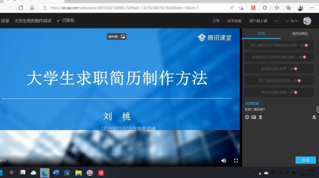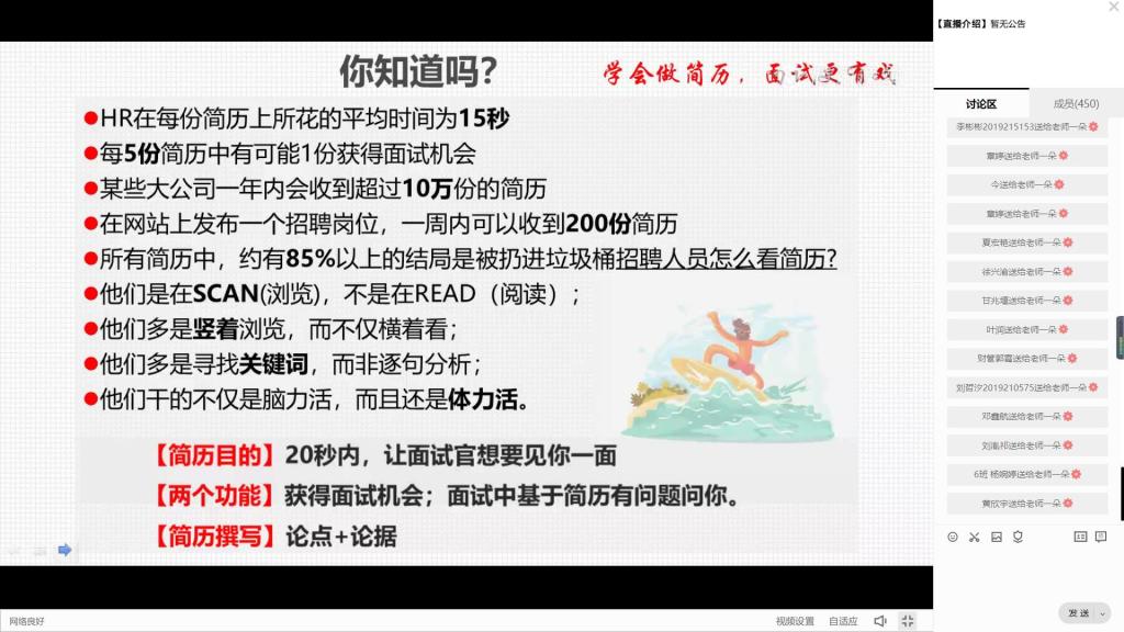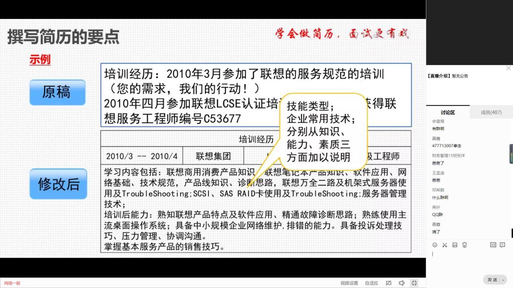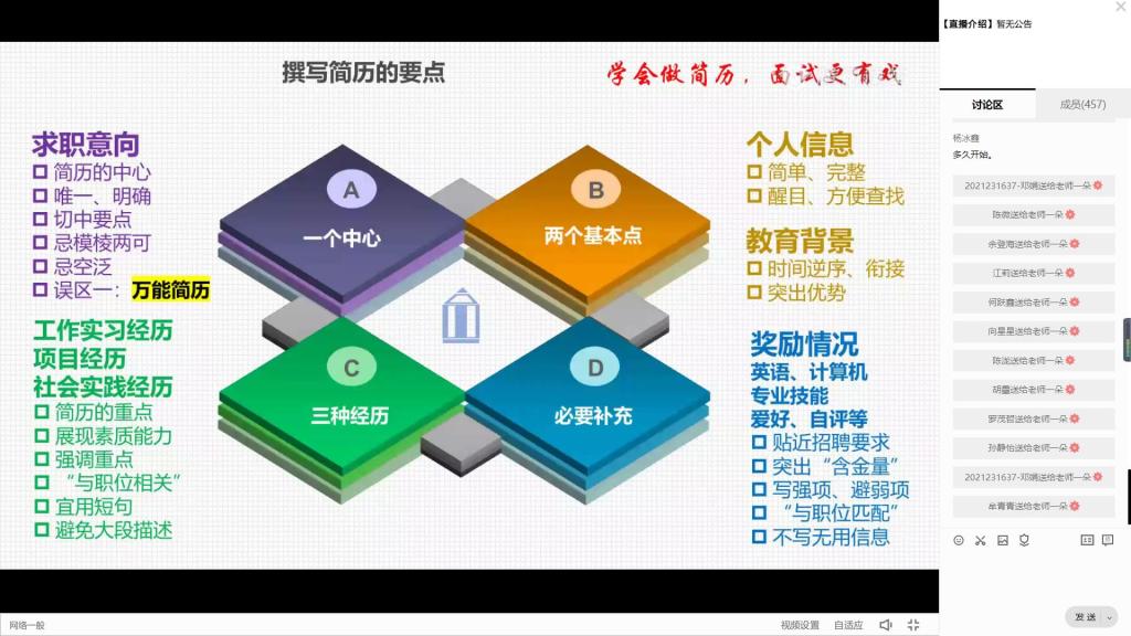 简历是一个内外双修的过程,既要了解企业也要了解自己,在两者之间不断进行匹配。刘桃老师指出制作简历要有的放矢,要根据目标岗位来做,透露出自身的职业素养以及能为公司带来的价值,有亮点地描绘能力特征,突出自己有的而别人没有的。刘桃老师建议大家要多去了解疫情背景下的就业情况,做好查漏补缺,通过参与学校社团活动积累经验,在实践磨练中探索前途未来,并训练语言表达能力与抗压能力。