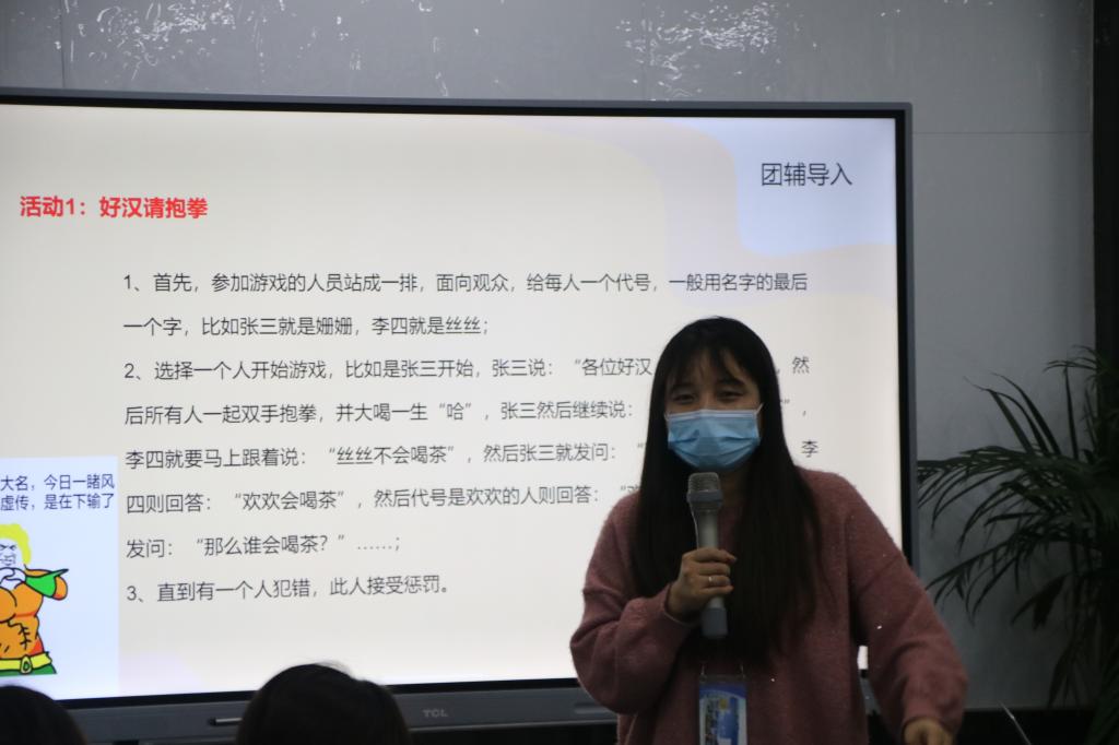 活动伊始,苏老师在进行简单的自我介绍后,将同学们分为四个小组,邀请同学们一起进行小游戏“好汉请抱拳”。通过游戏增进了苏老师和小组间的合作默契,活跃了整个现场的氛围,使同学们都对本次活动接下来的内容充满了好奇。同时苏老师让每位同学都进行了自我介绍,通过点评每个人的自我介绍,分析出同学们在表达方面有哪些薄弱和可圈可点的地方,用怎么介绍自己以此引出了活动的重点之处,怎么去做更好的自己。
