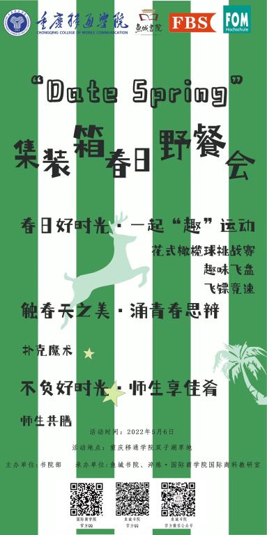 水晶帘动微风起,满架蔷薇一院香。逮住春日的尾巴,迎接夏日的阳光。为给国际商学院FOM本硕连读国际班师生营造轻松欢快的国际氛围和仪式感,5月7日在双子湖畔的草坪,国际商学院国际商科教研室联合鱼城书院共同举办“Date Spring”集装箱春日野餐会。