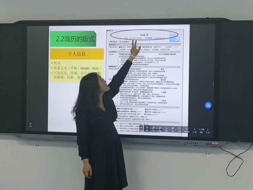 活动伊始,陈巧蓉老师带领同学们对简历进行了探讨,引导同学们思考,简历的目的是什么?简历的基本结构是什么?如何才能更好的展示个人的优势?陈老师讲到简历制作要注重“简”,一份好的简历应该根据不同的职位有明显的针对性和侧重点,与应聘工作无关的经验要力求简约。在简历的制作过程中,最重要的便是了解简历内容,弥补简历中的不足,以达到展现自己能力和明确个人应聘需求的目的。