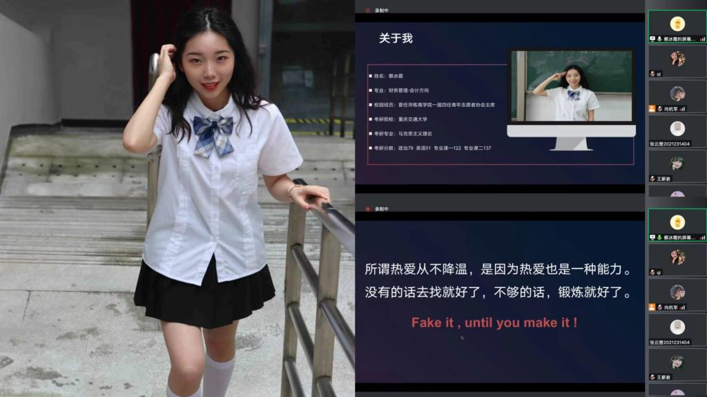 在主持人简要介绍嘉宾之后,蔡冰霜学姐身先士卒,从兴趣、难易度、地域、就业四方面为学子们讲解抉择考研方向的方法。分享的同时,以“过来人”的身份,告诫拥有考研想法的同学,为自己的时间按个“快进键”,及时的规划,早日确定自己的考研方向。“所谓热爱从不降温,是因为热爱也是一种能力,没有的就去寻找,热度不足,就去锻炼。”学姐也以自我的格言,表达出对学子们忠于热爱的强烈期望。