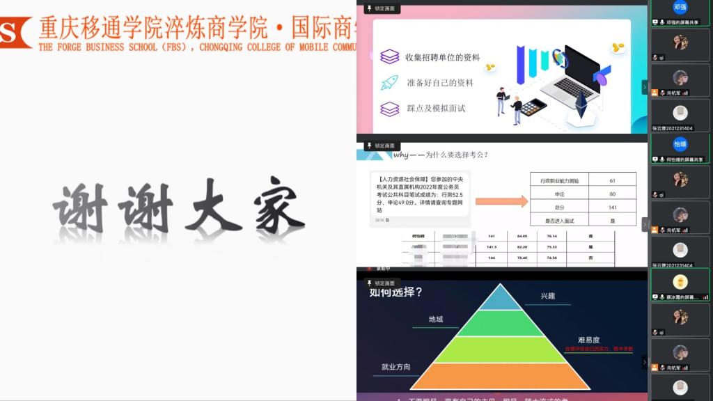 何怡晴学姐作为2022年重庆市选调生考试中岗位第一,主抓学生考公方向。她以开朗活泼的语言,拴住学子们的心,将公务员的本质、待遇、地位及前途一一传达于学子的“脑海知识存库”,并从省考、国考、选调三方面为大家做出考公的详细流程,提升学子们对考公的认知。随之,学姐以自身经验出发,为同学们分享自我学生干部经历、职业选择规划、社会实践经历及到最后的坚定选择,愿学子们可以从中得以启发,努力的自己不是不够好,而是需要更加坚强。