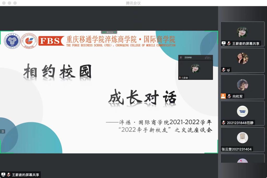 为帮助大三学子们加强对自我的认知,增强学院与校友间的联系,凝聚校友力量,淬炼·国际商学院就业助理团于2022年6月10日在腾讯会议上开展“相约校园,成长对话”——淬炼·国际商学院2021—2022学年“2022牵手新校友”之交流座谈会。本次座谈会邀请到的嘉宾是2018级优秀毕业生代表何怡晴,蔡冰霜和邓强。
