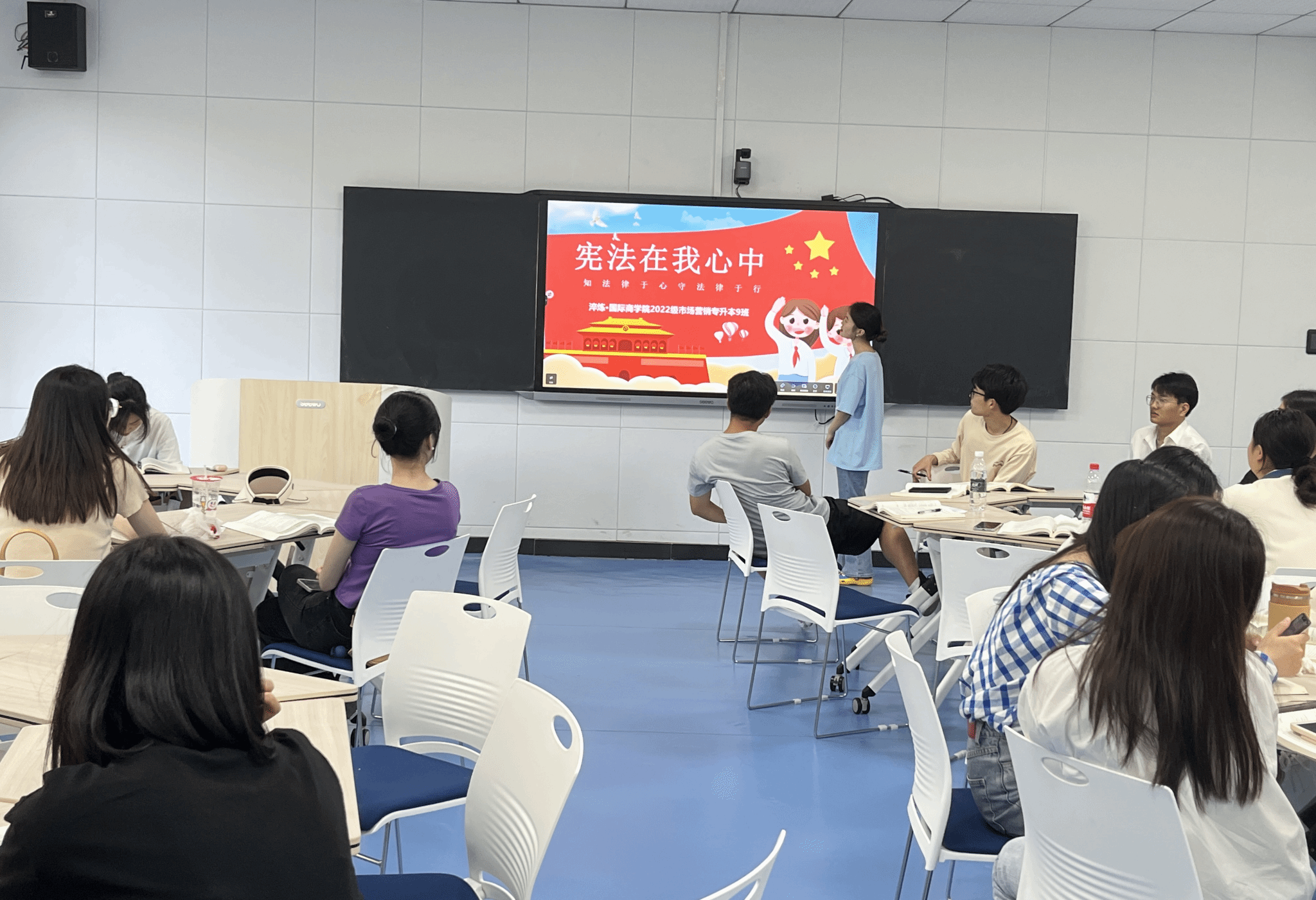 为进一步营造安全、文明的校园环境,引导同学们树立法治观念,增强学生的法治意识,争做遵纪守法的合格社会公民。因此,淬炼·国际商学院2022级市场营销专升本9班于2022年9月15日下午,在第五教学楼5203开展了以“宪法在我心中”为主题的班会活动。