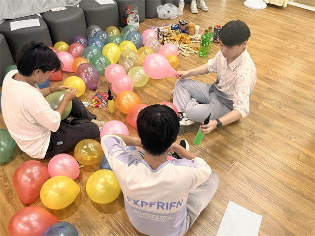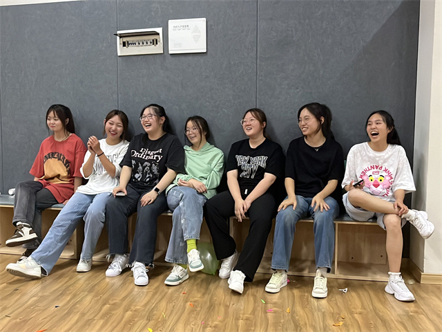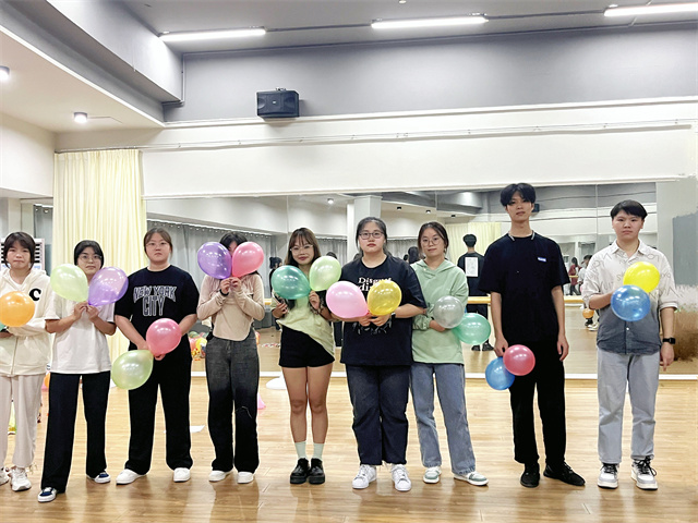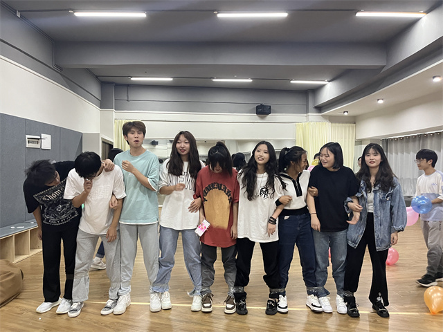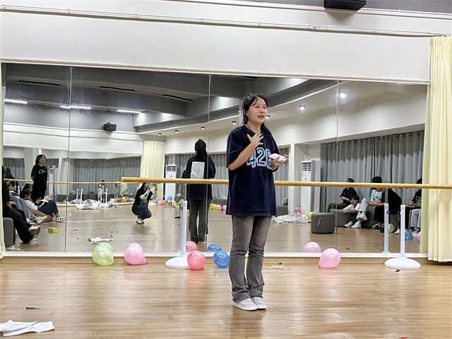 自我介绍让同学们熟络起来,紧张刺激的游戏拉近了同学们的距离。“N人N足”不但考验团队协作能力,也推进大家不断的交流和沟通,一组三人,分四组进行比拼,同学们并肩前行,共同带领着本组组员冲向终点;“气球踩踩踩”将现场气氛推向高潮,同学们好似脱缰之马,排练厅里气球破裂声、欢笑声此起彼伏;“车轮滚滚”考验着同学们的默契,三人一组,传送着粘成大圆圈的报纸抵达终点。几项小游戏将现场气氛炒得火热,让同学们的友谊升温,彻底打破交流隔阂。