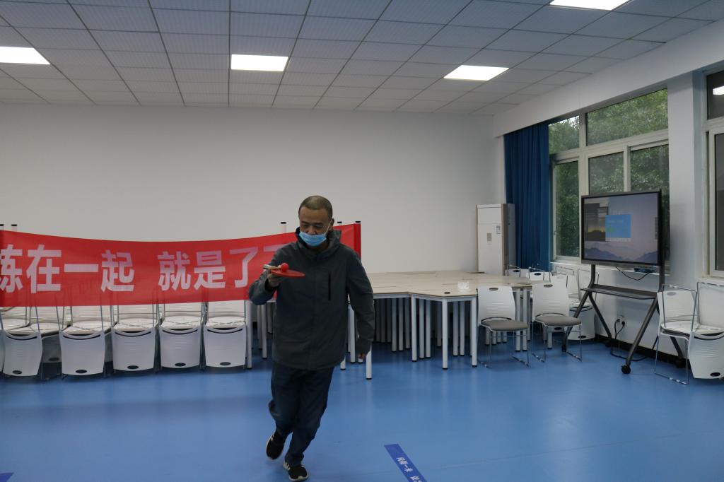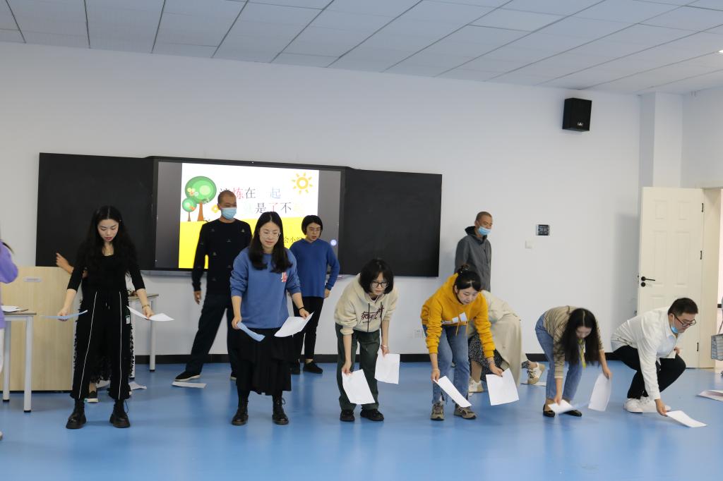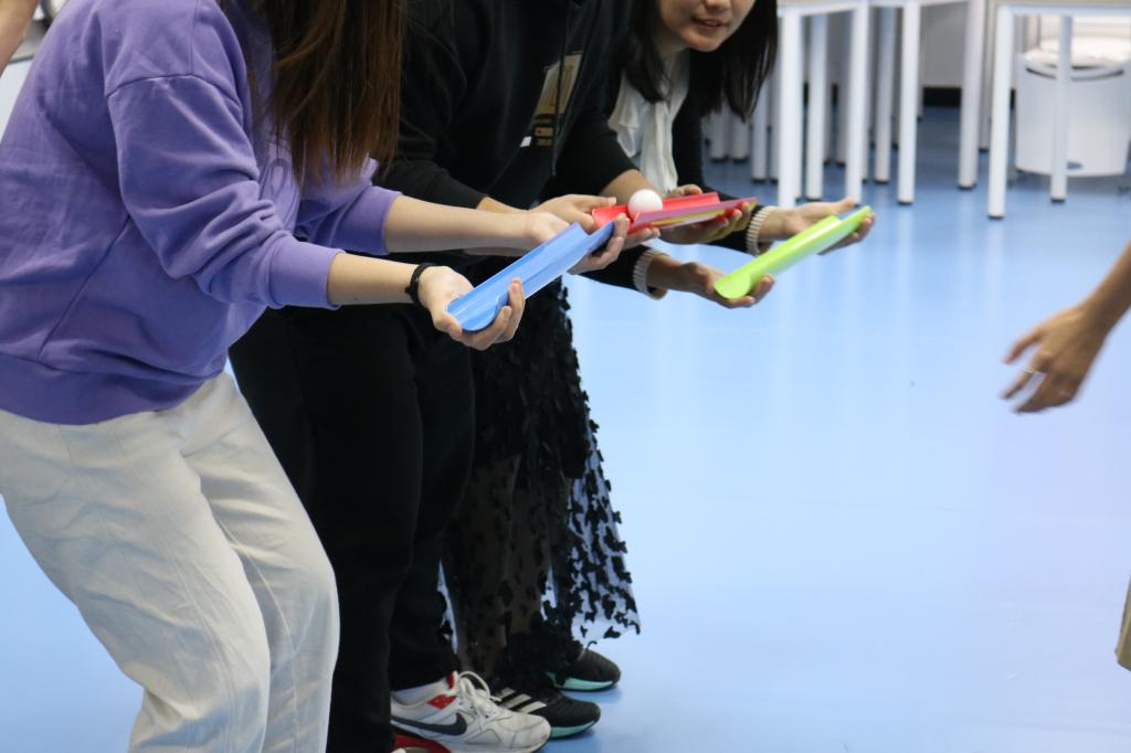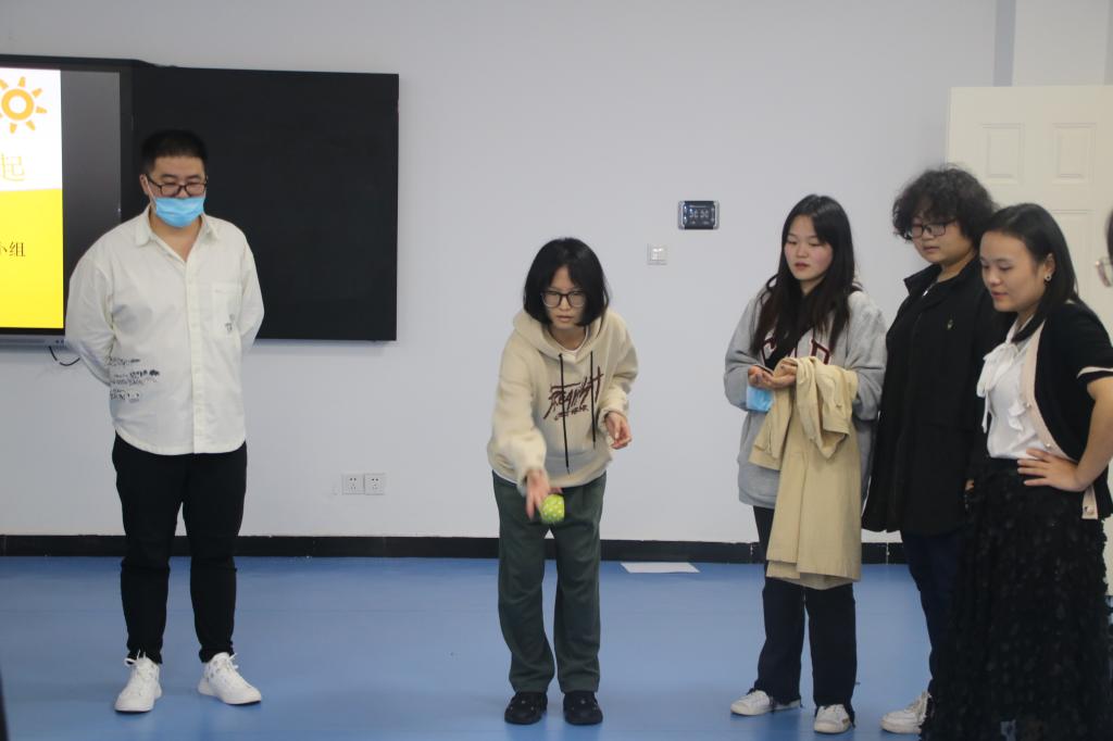 “一个人可以走得很快,一群人才能走得很远”。第一阶段的团队赛分为两个环节——“珠行万里”和“袋鼠跳”。“在一起”和“了不起”两个团队的老师们分别手持U形管一个紧接着一个地进行乒乓球传递,既要让乒乓球不掉落,又要争分夺秒,完成通关。“袋鼠跳”环节更是卯足了劲恨不得一跃三尺远,能争一秒是一秒。通过这两个团体游戏,学工团队间的默契明显增强,不管是“在一起”还是“了不起”,老师们都在你搭我一手,我帮你一把的过程中充分展现了淬炼的团魂。
