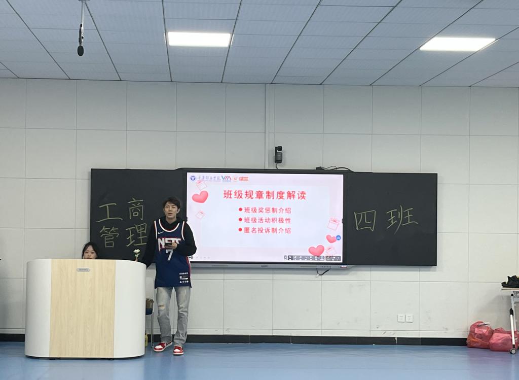 “没有规矩,不成方圆”,班会伊始由学习委员刘洋、文体委员樊国华、团支书陈颖、心理委员吴旭鹏分别对班级管理制度、班级活动积极性问题、青年大学生学习情况、匿名投诉制等进行讲解。刘洋讲到未来班级管理将采取加减分制,积极参加各项活动为班级争光可获得加分,无故旷课、不配合班级活动会进行减分,分数将作为班级评优评先的参考依据。班级成员可监督班委的所有工作,如有异议可通过匿名投诉的方式进行反馈。班级规章制度的明晰,有利于班级班风建设,营造积极向上的班级氛围。