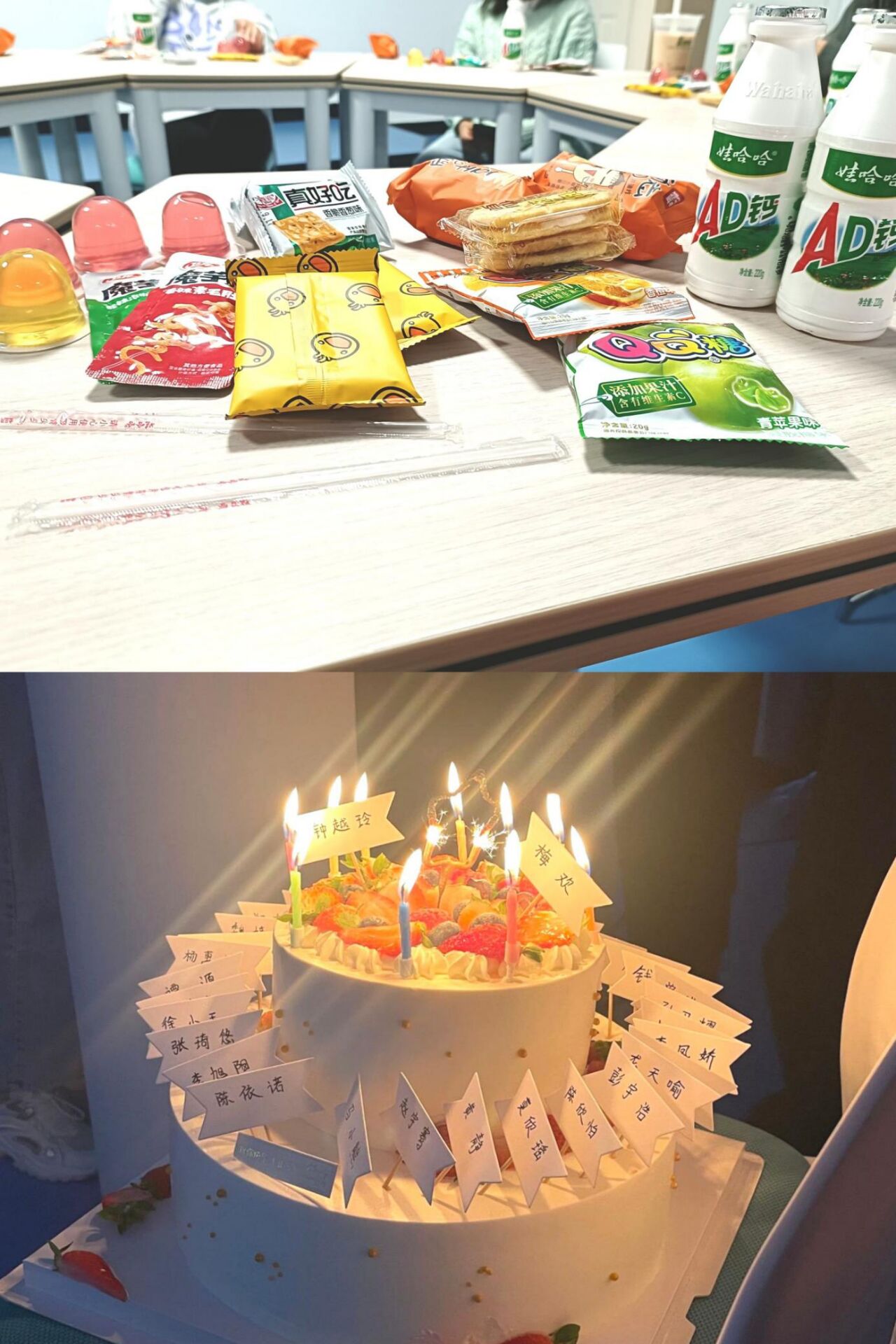 羡子年少正得路,有如扶桑初日升。在人生中最美好的年纪,我们有幸相聚在一起,共同见证这一美好的时刻。美味的蛋糕上写满了全班同学的名字,象征着20班的团结和圆满。关掉教室里明亮的白灼灯,橘黄色的烛光随风明灭,映照着全班同学的身影。温暖的烛光融化了同学之间最后的冰痕,也映照着此次班会的圆满结束。少年不惧岁月长,彼方尚有荣光在,愿今后的四年里,20班全体成员谱写出灿烂的青春,不负韶华,同心协契,共创未来!