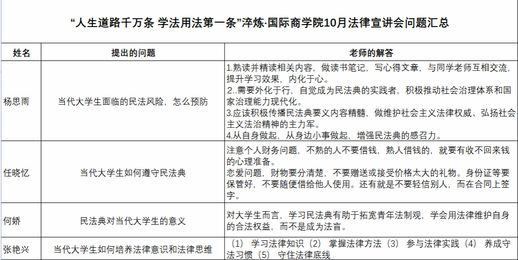 本次法律宣讲活动帮助学生增强了法制观念、构建正确法律认知,提高其学法、守法的自觉性。同学们能够做到学以致用,做到行为守法,以法律武器来维护自己的权益,并能自觉与违法行为作斗争。本次法律宣讲会向同学们普及有关民法和劳动法等法律的相关知识,推动法律学习的潮流,认真落实了法律宣传教育的开展,为和谐法治校园环境的构建贡献一份力量。
