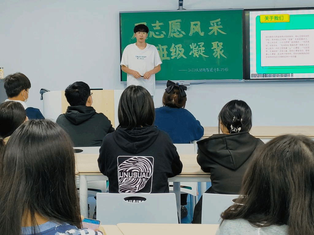 秋风送爽,鲜花馥郁。莘莘学子,走进大学府,开启新征程。为了加强同学之间的交流,增加班级凝聚力,更快地了解学校完满教育志愿服务板块,开展志愿服务工作,增强奉献精神。淬炼•国际商学院2022级财务管理中本29班于2022年10月14日晚上在五教201教室开展“展志愿风采·集班级凝聚”主题班会。