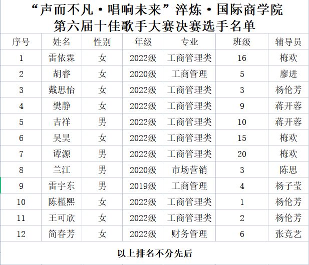 本次复赛共有12名选手晋级到决赛舞台,进行最终的“荣耀之战”,复赛至此落下帷幕。晋级的12名选手进入了最后的冲刺阶段,届时,12名“能力歌者”的同台竞技会擦出怎样的火花?一起感受校园歌手带来的音乐魅力吧,期待晋级的12名选手们在决赛中的卓越表现!