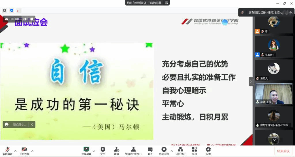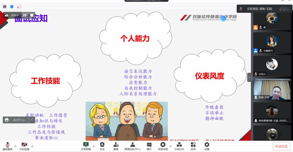 青春是阳光炙热的奔跑,是大雨磅礴的伫立。在求职实战中,许多应届生的简历如同广阔海滩中的小沙粒般没有辨识度,为让淬炼·国际商学院学子突出自身优势、掌握面试技巧,淬炼·国际商学院就业助理团举办的“面试技巧show·‘职’等你来”——淬炼·国际商学院就业沙龙活动于2022年10月20日通过腾讯会议开展。本此活动特别邀请到双体软件精英产业职场关键能力教师、重庆邮电大学项目管理工程硕士以及身为BCC全球生涯教练的王欣老师,以及大三的同学们。