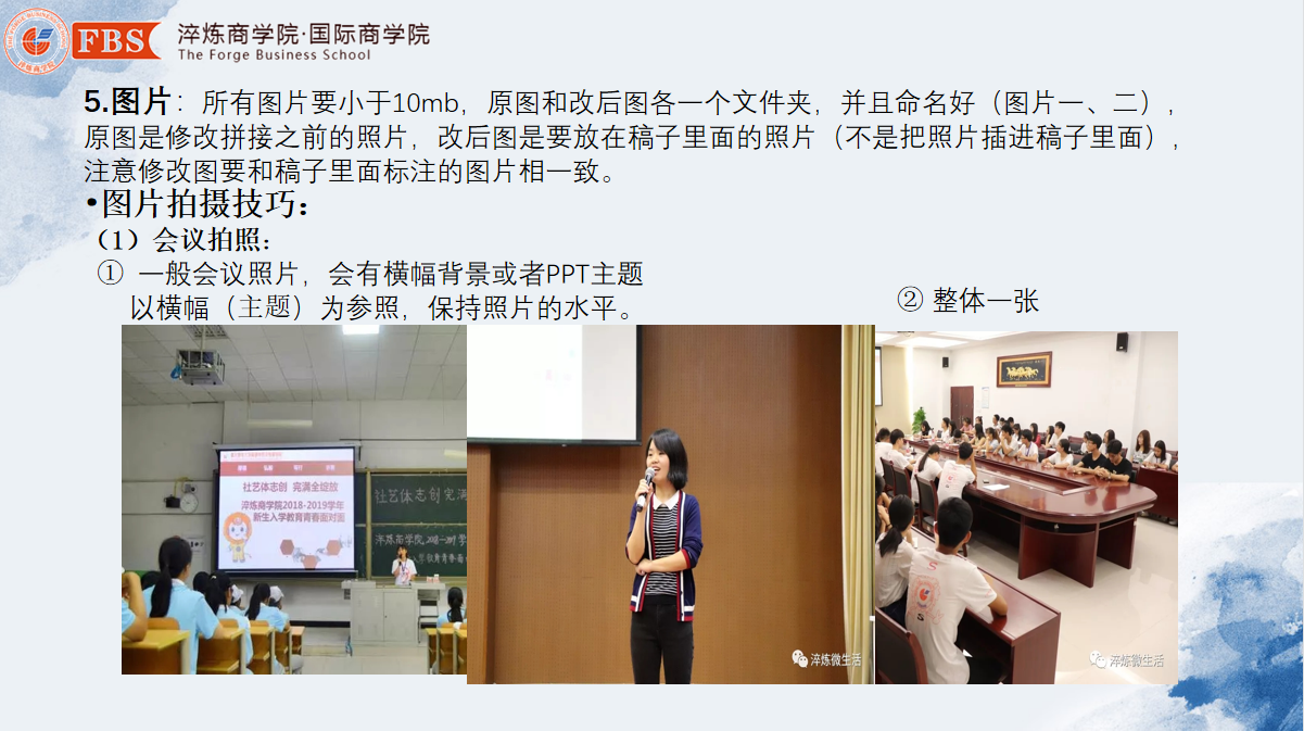 新闻稿往往是文字照片的结合,将文字的客观性和照片的真实性结合到一起,往往会让事件更有冲击力,让读者更有身临其境之感。此次培训会上,李思旋同学也从会议拍照和活动拍照两个方面展开讲解,并针对不同场景的照片示例进行详细的解读。“知之愈明,则行之愈笃;行之愈笃,则知之益明”。实践和理论相结合,才是学习最高效的方式。李思旋同学希望同学们在日常生活中多实践,多拍照,多找角度,总是会熟能生巧的。