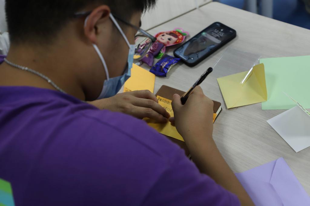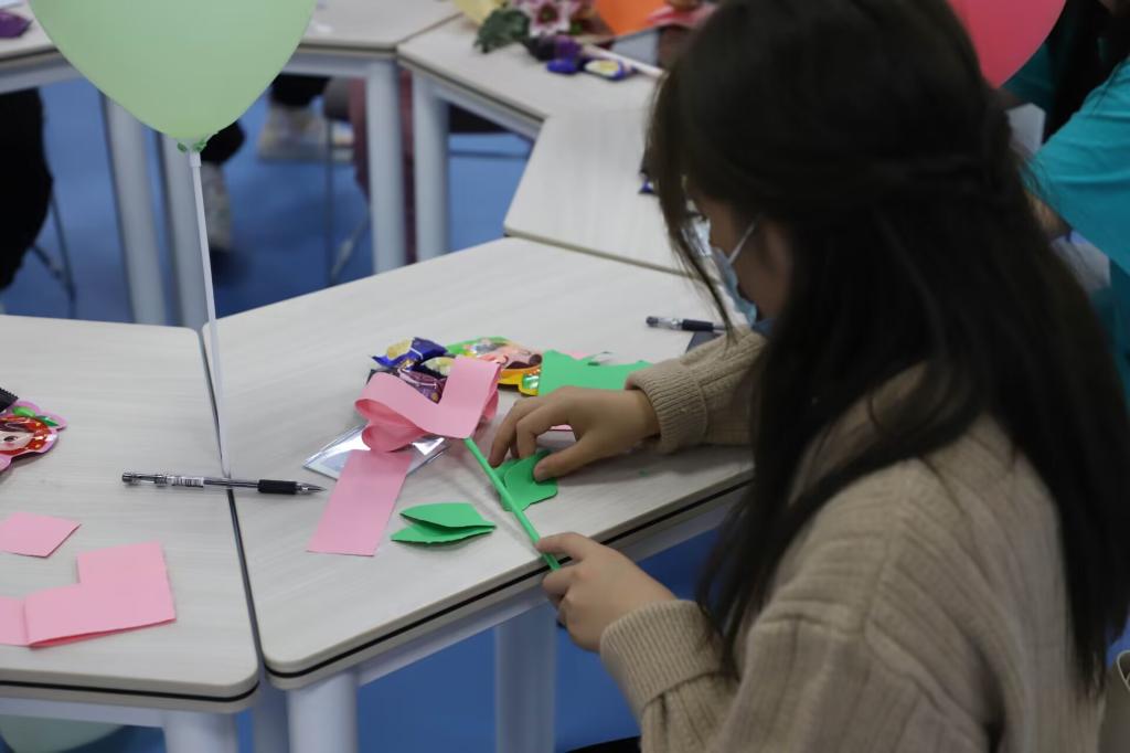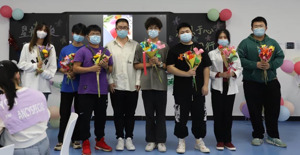花自知雨露之恩,所以开花报答;人应知他人之恩,用心以行回报。通过表演情景剧⟪平凡却温暖⟫以及防疫视频的观看,同学们又一次感受了身边这些平凡人带给我们的温暖,正因为有了他们,我们才能在社会中更好的生活,在校园中更加安心的学习。看着大家逐渐湿热的眼眶,两位主持提出手工制作花束送给身边想要感谢的平凡工作者。在场的同学们热情澎湃,以小组的形式共同制作花束,手写下贺卡,每位同学通过现场工作人员提供的材料,观看教学视频自由创作。经过制作并展示,整个现场充满了欢声。