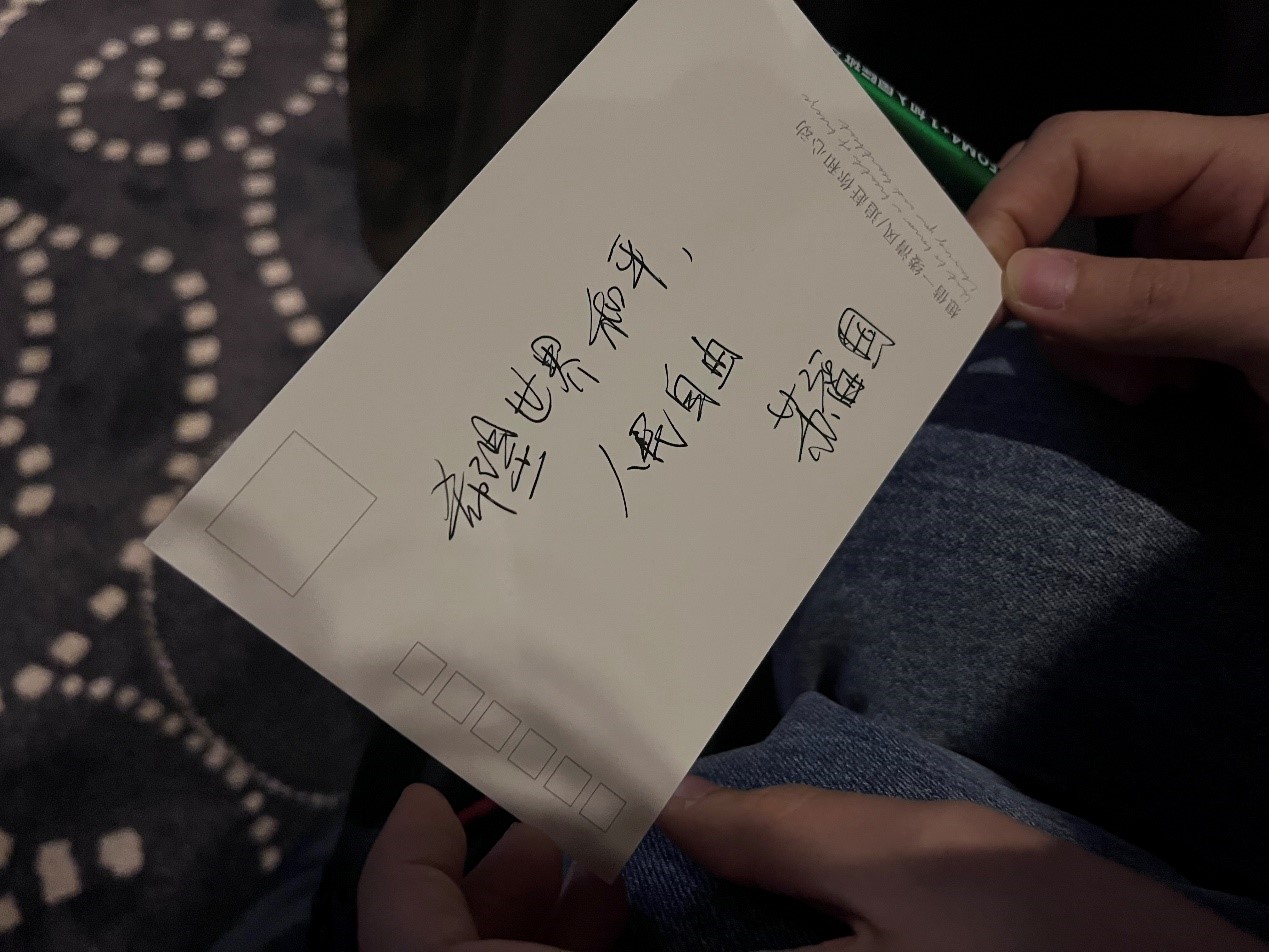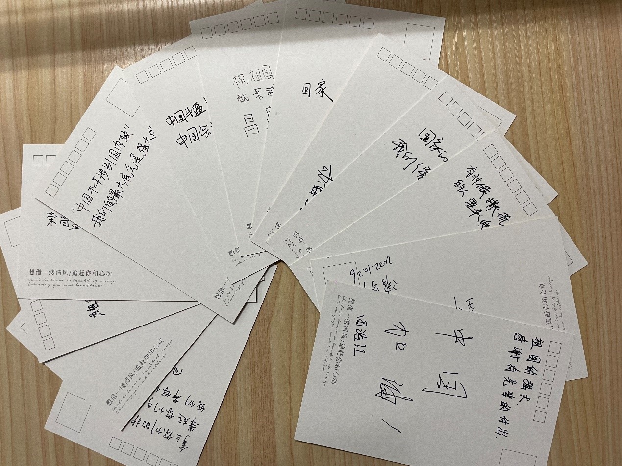 影片结束后,师生们都写下了自己的感想,并骄傲的挥舞着手上的五星红旗进行合影。一张纸心愿卡,承载了全体最诚挚的愿望“希望世界和平,人民自由”、“我为我是中国人骄傲”。电影是现实的缩影,对于国际商学院的师生来说,国泰民安才是出国留学最坚实的后盾。