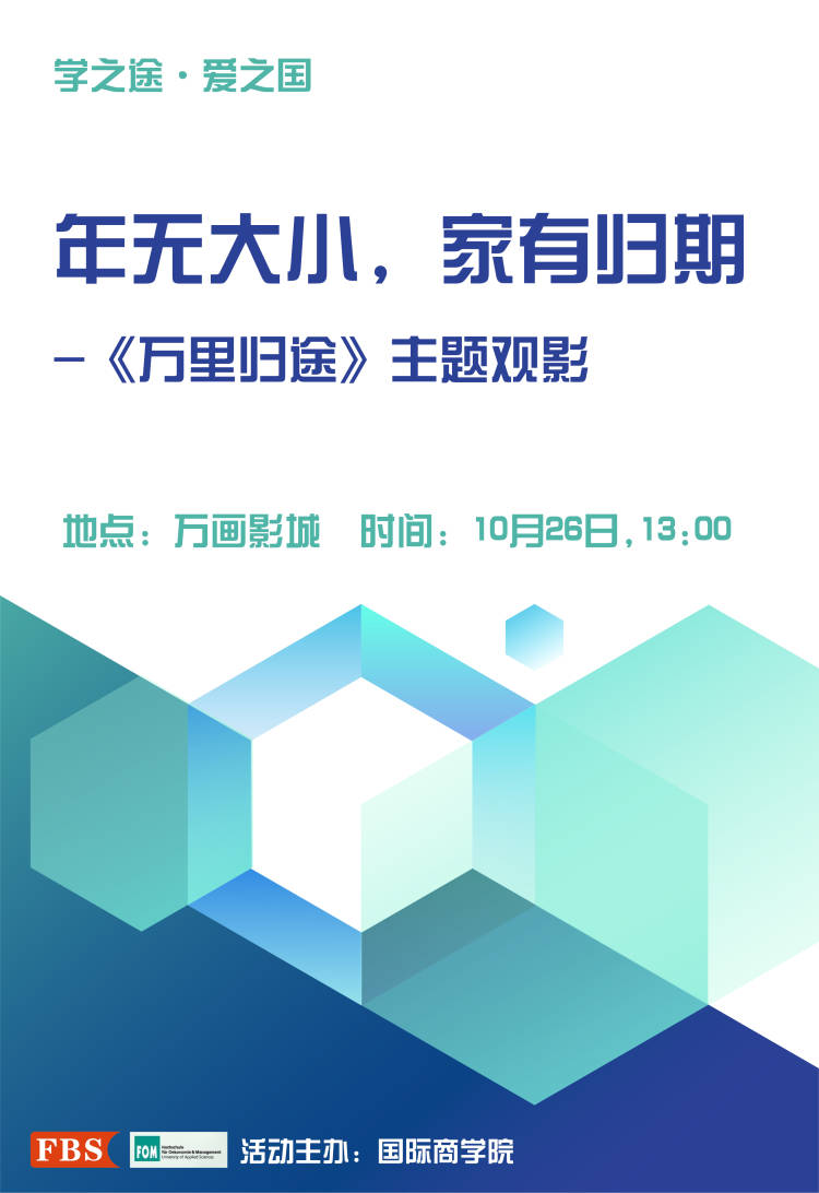 为了弘扬爱国主义精神,全面贯彻新时代中国特色社会主义思想,丰富国际商学院师生精神世界,国际商学院在10月26日13:00主办了“学之途·国之爱”爱国主义系列活动第一期:年无大小,家有归期——《万里归途》主题观影活动。国际商学院各年级的学生们和国际商科教研室全体教师汇聚万画影城,走进《万里归途》的故事。