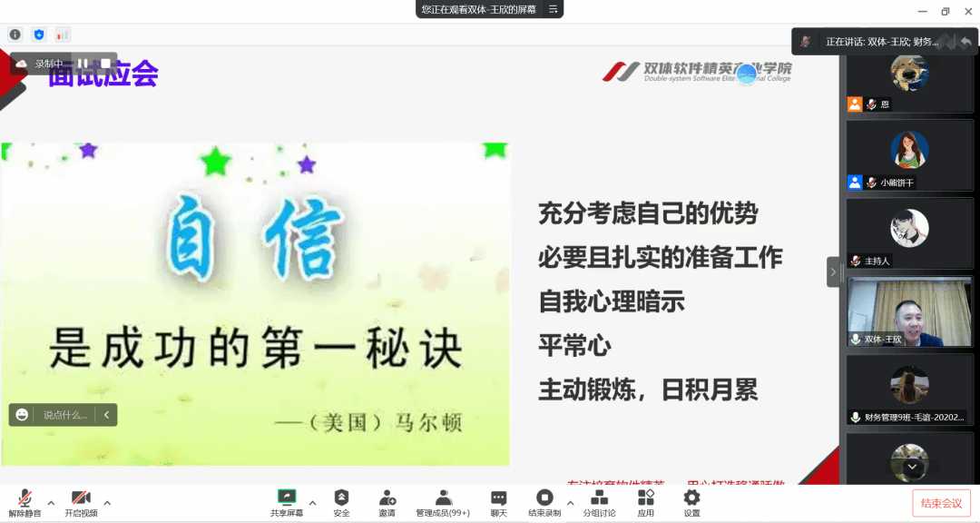 为了让我院学子了解就业形势,突出自身优势、掌握面试技巧,提高同学们的就业成功率。淬炼商学院就业助理团学创部于10月20日在腾讯会议线上举办了以“面试技巧show·‘职’等你来”为主题的就业创业活动,特别邀请到双体软件精英产业职场关键能力教师、重庆邮电大学项目管理工程硕士以及身为BCC全球生涯教练的王欣老师来给同学们讲解职场上面试过程中的技巧和注意事项。王欣老师说自信是成功的第一秘诀,希望我们在今后的就业过程中更加自信,抓住机遇,不负韶华。