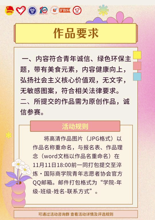 1、高清作品图片(JPG格式以作品名称重命名),与报名表、作品理念(word文档以作品名重命名)在11月11日18:00前一同打包提交至淬炼·国际商学院青年志愿者协会官方QQ邮箱。