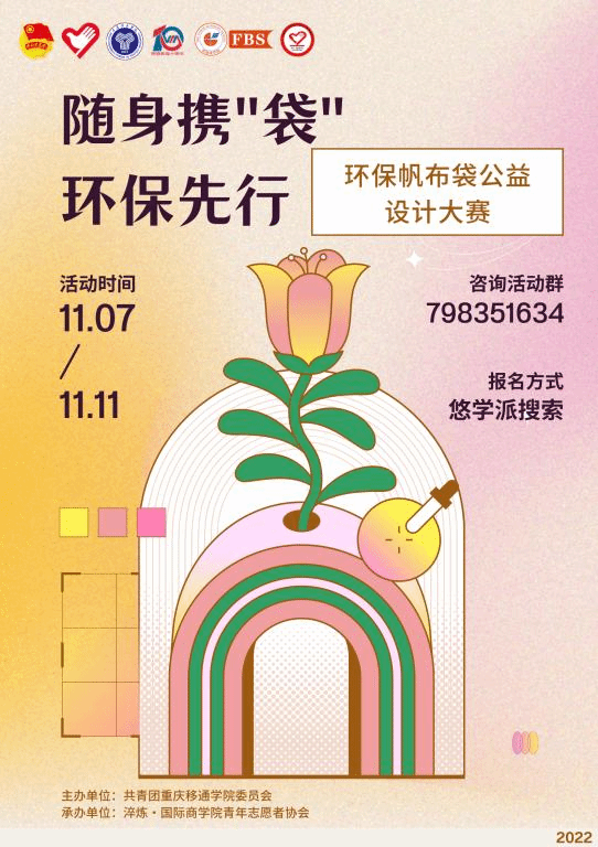 小志发现在校园生活中大部分同学都用一次性塑料袋打包食物,去超市购物也喜欢使用一次性塑料袋,塑料垃圾对环境的危害非常大,据统计目前只有9%的塑料垃圾被回收利用,大约只有12%的塑料垃圾被焚烧,其余79%堆积在垃圾填埋场流入大自然环境中。作为青年学子的我们更要加入“塑战塑决”的行列里,现淬炼·国际商学院青年志愿者协会特举办“随身携“袋”·环保先行——环保帆布袋公益设计大赛”向你发出邀约,同学们快行动起来吧!