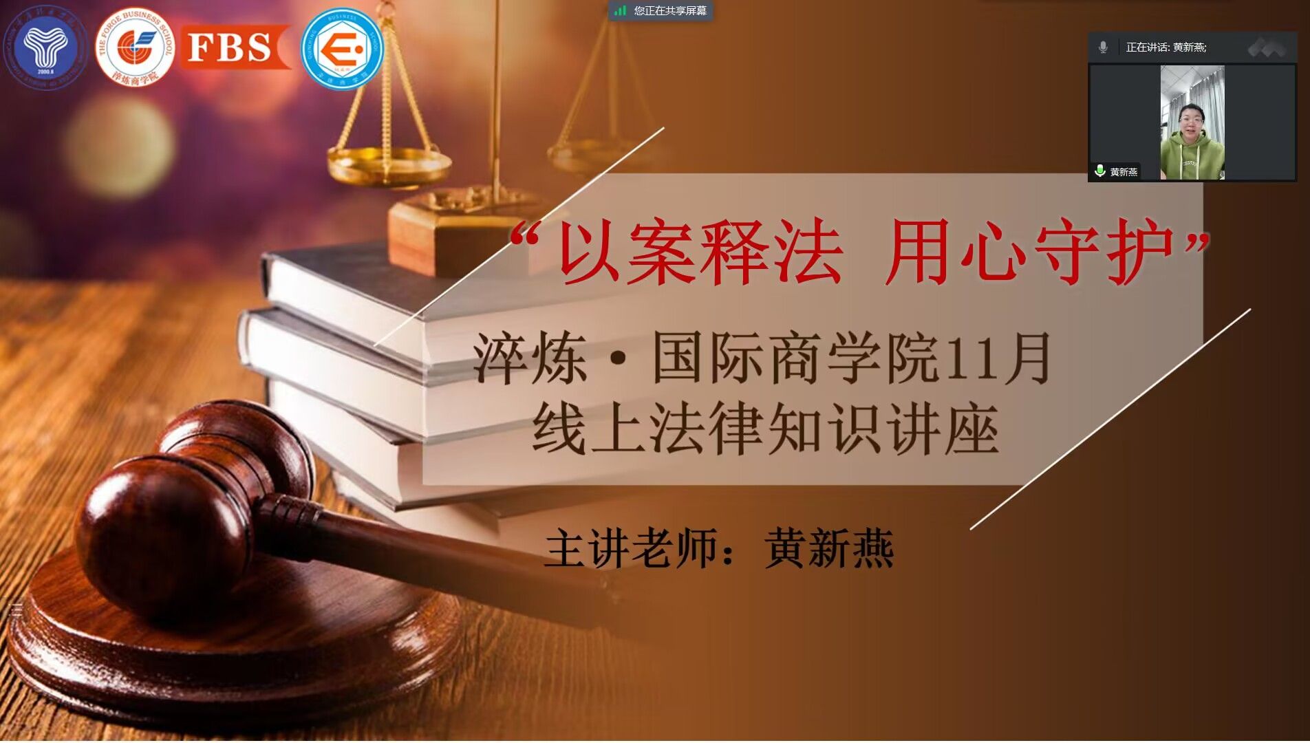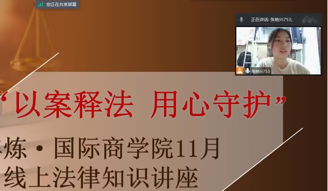 法律是维护社会稳定的基础规则,而对于即将面向社会的大学上而言,学法更是必不可少的课程。为提高同学们的法律修养,使学生能够在日后的学习工作生活过程中正确行使权力、正确的履行应尽的义务,在学习生活中,更能正确地遵守法律规定,能够免侵权困扰,保护自身生命财产安全,淬炼·国际商学院于二零二二年十一月十五日举办本次线上法律宣讲会,淬炼·国际商学院团总支书记黄新燕老师担任主讲人。