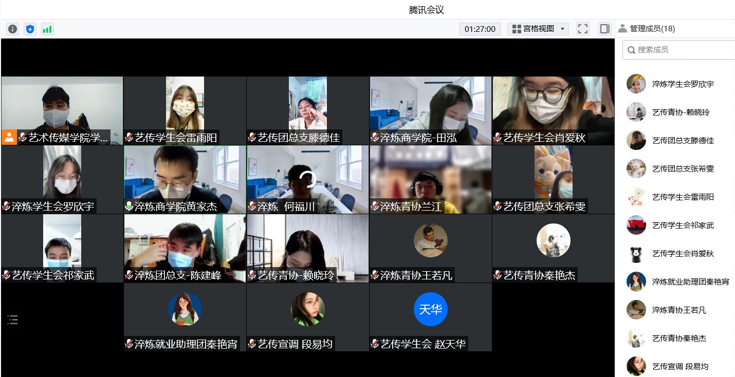 紧接着,对于当下学校疫情防控状态,两个学院对近期活动开展的基本情况进行了介绍,就活动开展的问题进行交流。艺术传媒学院主席团成员就“寝室创意合照”、“情书撰写”、“k歌大赛”以及“寝室趣味投篮”等活动举办方面进行分享,这些活动采用线上形式开展,大大增添了同学们封控生活的乐趣。不仅如此,双方就各部门的主要工作互通有无,进行友好的工作交流,对团总支的青马工程和学代会进行讨论总结,双方在工作问题方面进行针对性解答。
