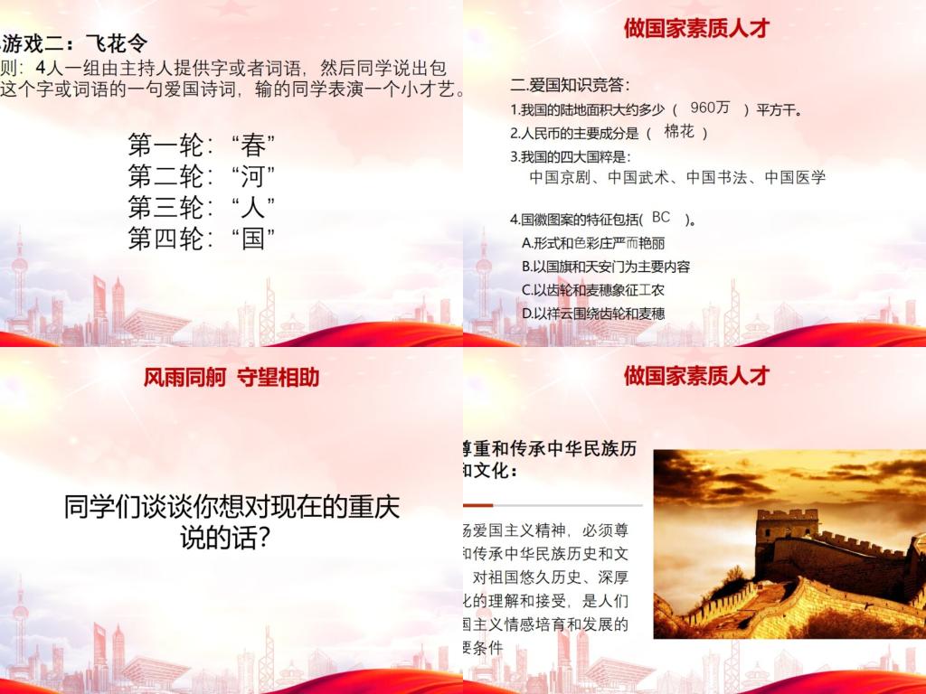 一代人有一代人的长征,一代人有一代人的使命,时代的接力棒传到我们这里,我们能做的就是配合国家的政策,积极响应国家,安静的完善自己。在观看完重庆疫情之下的艰难形式之后,我们呼吁同学们积极的参与到线上防疫知识以及爱国知识的答题环节中,利用游戏抢答的方式,在整个答题过程中同学们纷纷举手积极回答反应迅速。答题的环节简短,却也起到了弘扬爱国主义精神的作用。弘扬爱国主义精神,必须尊重和传承中华民族历史和文化。对祖国悠久历史、深厚文化的理解和接受,是人们爱国主义情感培育和发展的重要条件。