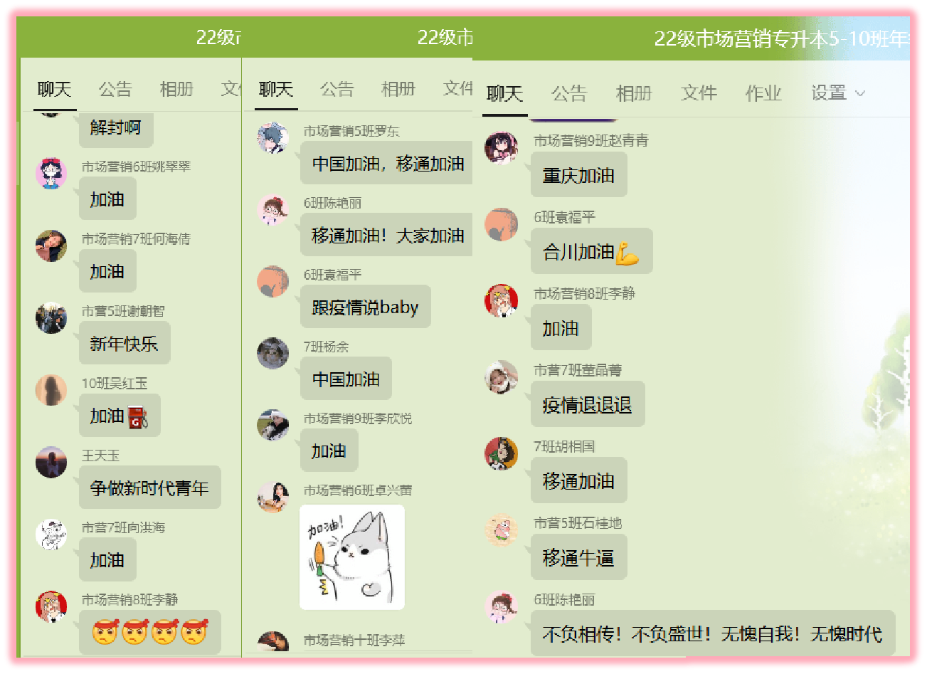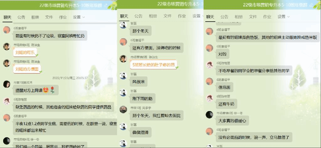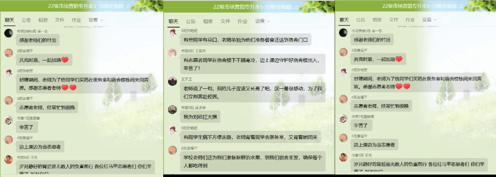 现如今新冠疫情的肆虐蔓延,疫情反反复复。2022年11月24日,2022级市场营销专升本5-10班成员与辅导员黄新燕老师于2022级市场营销专升本5-10班年级群召开了“隔离不隔爱·我们在‘疫’起”为主题的年级会。