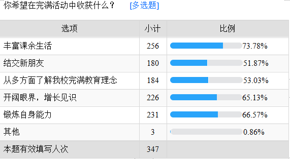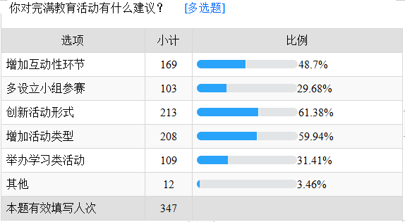 此外,同学们都非常希望在多样多化的完满教育活动中收获知识、能力、朋友。其中共有256名同学希望在参与活动中能丰富自己的课余生活及学习到一定的能力,180名同学希望在参与完满教育活动中结交到新的朋友,占比率达到了51.87%。
