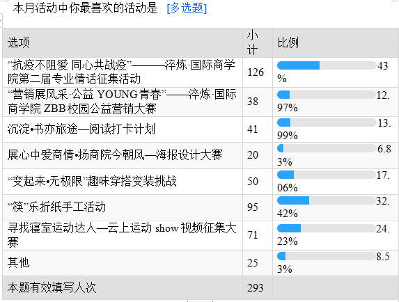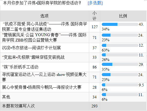本次调研共有347名同学参加,根据回收的293份有效问卷调查结果显示,活动“抗疫不阻爱 同心共战疫”———淬炼·国际商学院第二届专业情话征集活动成为了本月淬炼·国际商学院完满教育活动喜爱之最,获得126名学生的好评,占比达43%。