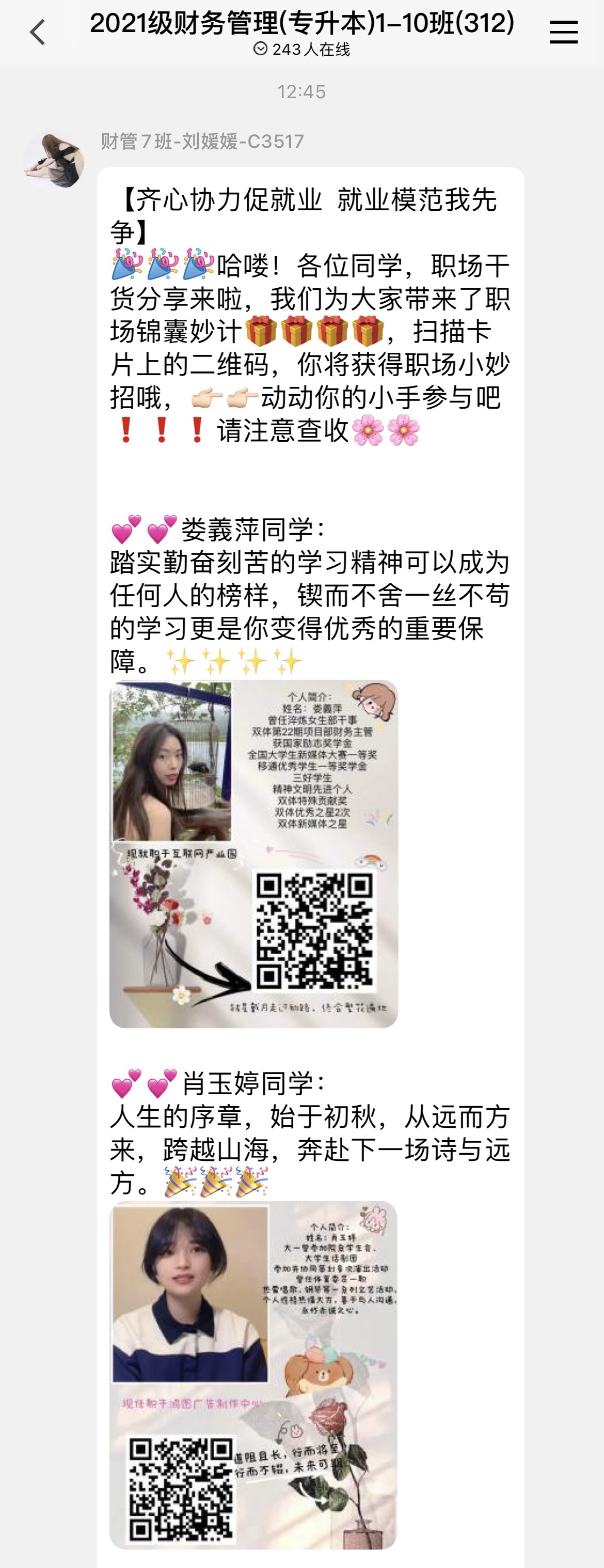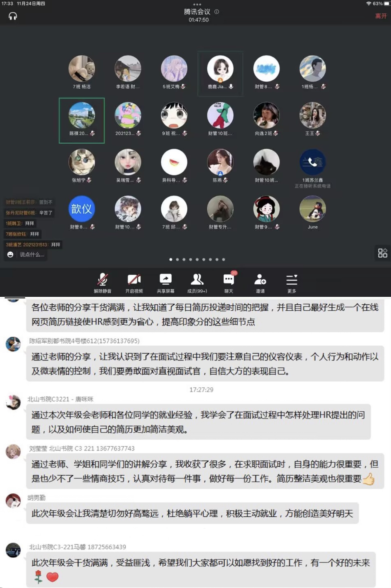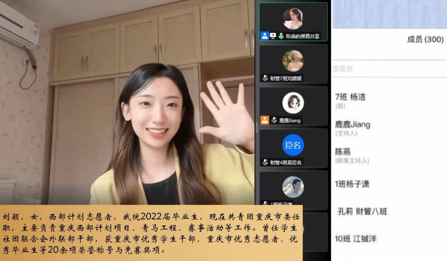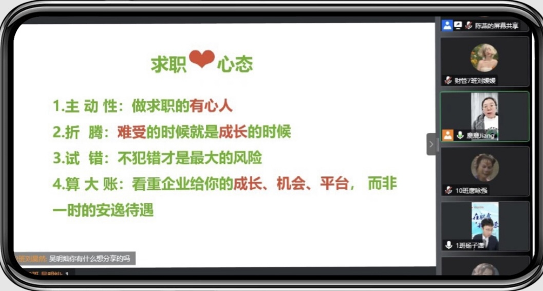 为纾解毕业生当前就业压力,明晰个人定位,提高就业能力,促进毕业生积极就业。淬炼·国际商学院2021级财务管理专升本1-10班于2022年11月24日下午四时,在腾讯会议开展以“人在职途,“职”赢未来”为主题的年级会。本次年级会聚焦“专业指导+整合资源+商科思维”、以“线上+线下”互动式就业解答,西部计划、创业典型人物分享,“主活动+子活动”求职实践等,多维发力促就业。本次出席会议的嘉宾有异科导师姜璐、帅易琼、许琳、熊光源、张旭宁、杨帆,西部计划志愿者2022届毕业生刘颖学姐和辅导员王玉勤。
