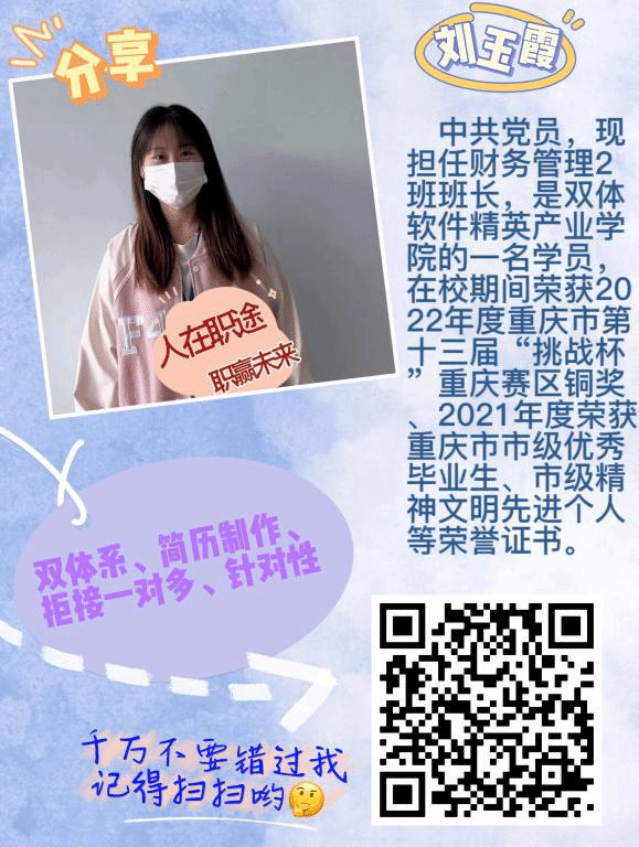 精准发力促就业,了解政策显成效。西部计划志愿者2022届毕业生刘颖学姐,为大家揭开西部计划神秘面纱。学姐目前在共青团重庆市委任职,从西部计划是什么、报考条件、服务期、如何让自己更有优势等多维分享,引领毕业生服务基层,服务地方,将个人发展融入国家事业,在奋斗中建功立业。