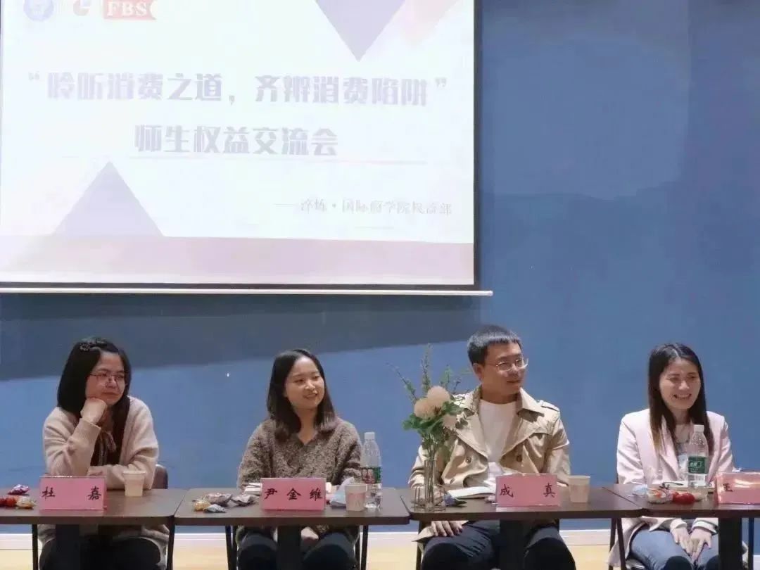 随着经济快速发展,大学生成为社会不可或缺的特殊消费群体,面临类似“双十一”这样的大型购物节,他们更是消费的主力军,但由于对维护自身消费权益意识的缺乏,大学生往往会陷入消费困境,故为引导同学们树立正确的消费观念,舒缓学生消费心理压力,学会利用法律知识维护自己的合法权益,淬炼·国际商学院权益部于2022年11月25日开展了以“聆听消费之道·齐辨消费陷阱”为主题的师生权益交流会。此次活动邀请到重庆移通学院淬炼·国际商学院学工办主任尹金维老师,任课教师杜嘉老师,2021级辅导员老师成真老师、王凤老师、肖琳老师、苟桃吉老师。