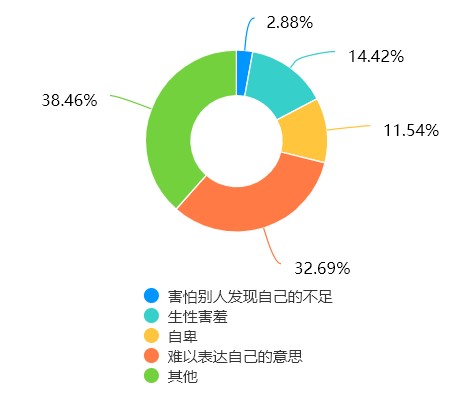 根据数据显示,同学们不想社交的原因各不相同,大部分同学是因为难以在社交中清晰地表达自己的意思,还有一部分同学是因为生性害羞、自卑等原因。大家出现这种情况更多是出于自身原因,对于这种状况,同学们可以通过锻炼自己的表达能力,在尝试的过程中不断提升表达自信,努力做到从害羞到坦然的心理改变。