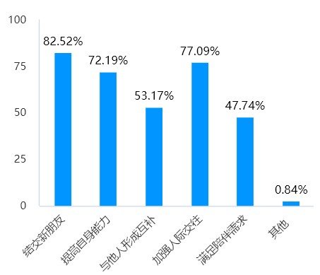 根据数据显示,同学们进行社交的原因各种各样,大部分同学们认为社交能扩大自己的交友圈、加强人际交往、实现自我价值等,这些原因促使同学们进行社交。对同学们来说与志同道合的人交朋友也是一件愉快的事情,积极向上的氛围,使其共同进步。