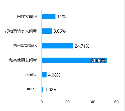 根据调查结果显示,同学们在社交中对朋友的依赖性很强,但也有一部分同学选择自己默默消化,此类同学可以积极沟通问题,大方地说出来!做到积极面对问题,勇于承担问题,乐于解决问题。