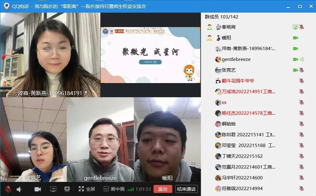 为切实维护同学们的身心健康和生命安全,全校师生团结一心、众志成城抗击疫情。淬炼·国际商学院特此于12月1日在线上举办“‘合’你一起,战疫可期 ”——12月权益师生交流会。此次交流活动邀请到淬炼·国际商学院院长张平、淬炼·国际商学院团总支书记黄新燕、淬炼 ·国际商学院安全稳定板块老师张竞艺为各位同学献出面对疫情的锦囊妙计,提供心理辅导,帮助同学解决防疫过程中的困惑,舒缓同学们疫情学习的双重压力。