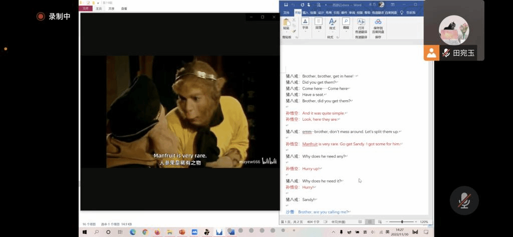 最后来到了双人配音阶段,由田宛玉老师带领学生一起为西游记英文版配音,一个人饰演两个角色,师生联动共同完成。同学们都不禁发出感叹:“我们平时经常看的西游记原来还有英文版本呀!”“这几句台词的翻译也太有趣了吧!”通过趣味性的配音片段,同学们都增加了对英语学习的兴趣。