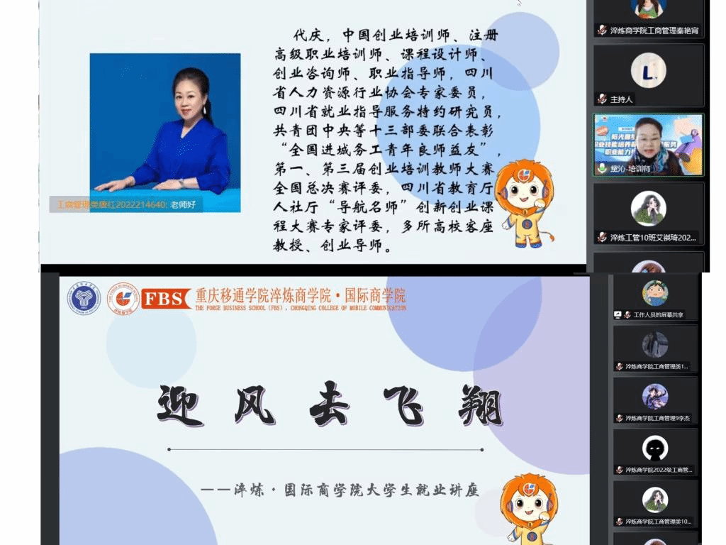 为了让同学们进一步了解当前就业形势,开拓视野、掌握就业知识,并做好初步就业规划。淬炼·国际商学院就业助理团于2022年12月9日15:00通过腾讯会议举办“迎风去飞翔”——淬炼·国际商学院大学生就业讲座,本次讲座有幸邀请到中国创业培训师、注册高级职业培训师、课程设计师、创业咨询师、职业指导师、四川省人力资源行业协会专家委员、四川省就业指导服务特约研究员代庆老师为同学们进行就业相关指导。