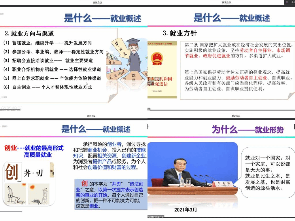 树根越深扎于土层树就越繁茂不衰,人越脚踏实地,在人生路上就能走得越远。代庆老师通过分析《中华人民共和国就业促进法》,让同学们更深入了解到国家宏观的就业方针。对于就业渠道和就业方向代庆老师建议同学们应该提升发展方向、稳定就业方向,以及进行选择性就业、网上自荐、自主创业进行多渠道就业;对于有创业想法的同学,代庆老师指出:创业有风险,投资需谨慎,要切合自身实际,确保自己有足够创业资源和想法,再选择自主创业,切勿因没有合适就业岗位而去选择创业!