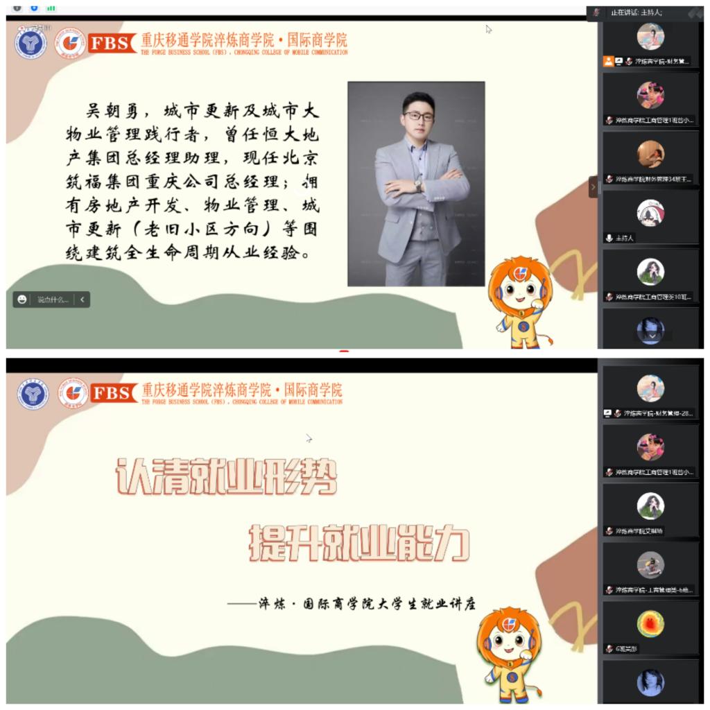 为引导同学们进一步认清当前就业形势,转变就业观念,不断提升同学们积极就业的意识,提前做好就业准备。由就业创业指导与服务中心主办、淬炼·国际商学院就承办的认清就业形势·提升就业能力——淬炼·国际商学院大学生就业讲座于2022年12月14日15:00在腾讯会议举行。本次讲座有幸邀请到北京筑福集团重庆公司总经理,拥有房地产开发、物业管理、城市更新等丰富从业经验的吴朝勇老师为同学们进行相关就业指导。