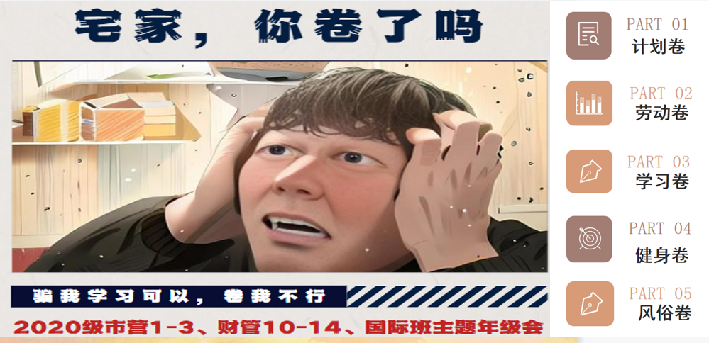 在“计划卷”的篇章中,同学们提前录制好了轻松幽默的短视频作为开场。线上同学也从自我学习与宅家生活出发,分享了自己的假期计划。英语学习、发掘爱好、考研备考等,一件小事一些收获,大家畅所欲言。辅导员陈思老师鼓励大家珍惜美好的假期生活与成长机会锻造更强大的自己。家长也成为同学们假期计划的监督员,将对大家的假期生活开展全面的督促。