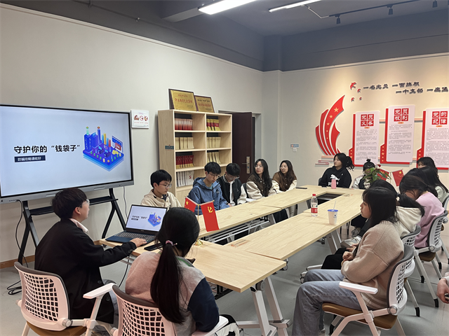 紧接着,班长向同学们进行了反诈防贷宣讲,列举了四种诈骗类型,其中包括高利理财类欺诈、网络贷款类欺诈、网络众筹类欺诈、消费金融类欺诈,并对其一一作出解释说明,让同学们更加了解其中套路,使反诈防贷意识深入人心。
