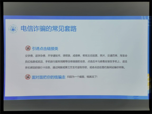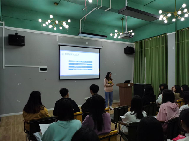 针对各种诈骗情况,在主题班会中,主持人给同学们详细介绍了“大学生常见别骗类型“以及”如何防范电信诈骗“。其中列举了电信诈骗的常见套路,详细介绍了防范诈骗的方法,如遇到可疑电话、链接,采取不轻信、不理睬、不回复的态度。同学们现在也开始面临找工作的情况,在找工作时一定要谨慎,在积极的找工作的同时,提高自身防骗意识,以防受骗。但如果最后不幸受骗,一定要第一时间收集好自己手上的证据报警,通知家长、老师一起想办法解决。