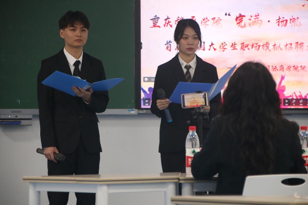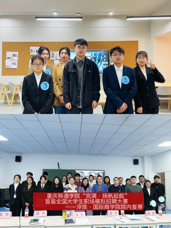 “日月不肯迟,四时相催迫。”在这个属于奋斗者的新时代,人人都有追梦的权利,人人是梦想的筑造者。为提高淬炼学子们职场专业技能和抗压能力,由就业创业指导与服务中心主办,淬炼·国际商学院就业助理团承办的重庆移通学院“完满·扬帆起航”首届全国大学生职场模拟招聘大赛——淬炼·国际商学院院内复赛于2023年3月16日在第五教学楼5202(合川)和綦河书院一号楼长风·交流空间(綦江)开展。本次活动有幸邀请淬炼·国际商学院学工副院长刘薇唯老师、重庆移通学院创新创业五星级导师廖阳老师、重庆移通学院创新创业四星级导师卢伯年老师、重庆移通学院创新创业一星级导师莫晓雯老师、(綦江校区)学工办主任尹金维老师、重庆移通学院就业创业导师汤世才老师、(綦江校区)就业工作指导孙成彬老师、淬炼·国际商学院就业创业办公室主任杨伦芳老师担任本次职场模拟招聘大赛的评委老师。